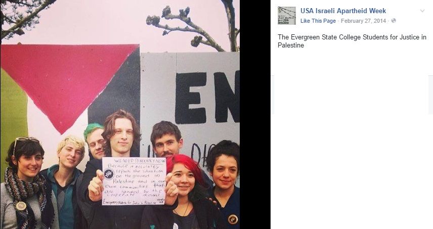 In February 2014, SJP TESC hosted TESC’s Israeli Apartheid Week. The week-long event featured false claims that Israel is an "apartheid state" and showcased the construction of a mock “Apartheid Wall" to mischaracterize Israel’s security fence.