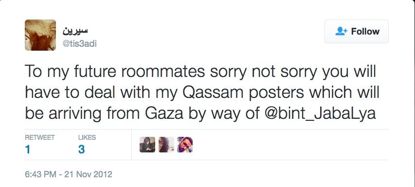 On November 21, 2012, Najjar tweeted: “To my future roommates sorry not sorry you will have to deal with my Qassam posters which will be arriving from Gaza”.