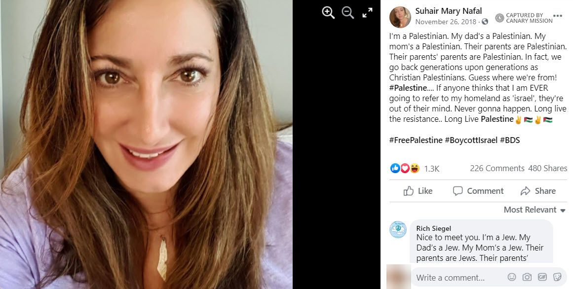 Suhair Mary Nafal has spread anti-Semitism, promoted anti-Semitic conspiracy theories, defended the terror group Hamas, celebrated terrorism and expressed support for terrorists.In 2020, Nafal was sued in Orange County, California for defamation by a former Israeli soldier (and American Citizen), Rebecca Rumshiskaya, over a Facebook post by Nafal that demonized Rumshiskaya. The post went viral and resulted in Rumshiskaya receiving death threats.