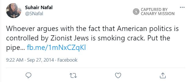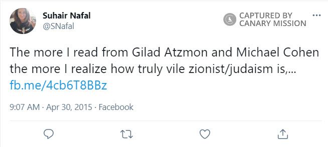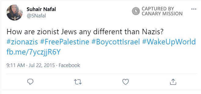 On July 22, 2015, Nafal tweeted: “How are zionist Jews any different than Nazis? #zionazis #FreePalestine #BoycottIsrael #WakeUpWorld.”