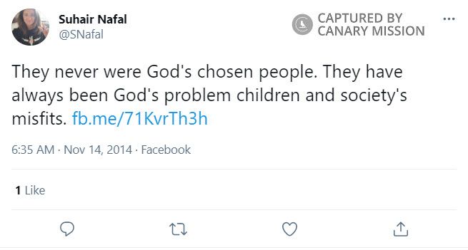 On April 20, 2015, Nafal tweeted: “Typical zionists.They're just nasty and awful no matter where they are in the world.”