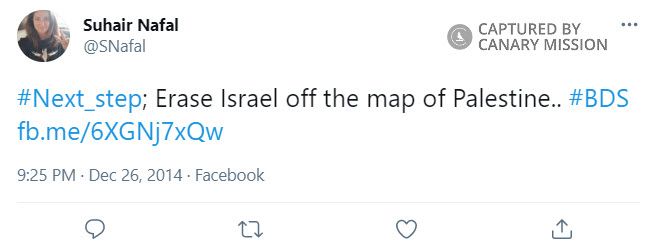 On December 26, 2014, Nafal tweeted: “#Next_step; Erase Israel off the map of Palestine.. #BDS.” Her tweet linked to an article titled “PRESBYTERIAN CHURCH USA VOTED ON ERASING ‘ISRAEL’ FROM PRAYERS.”