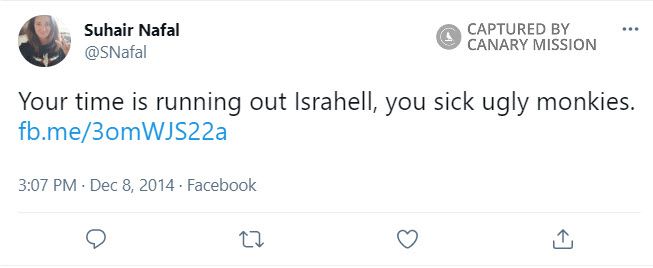 On November 11, 2014, Nafal tweeted: “#israeli_are_not_human.”