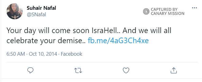 On October 10, 2014, Nafal tweeted: “Your day will come soon IsraHell.. And we will all celebrate your demise..”