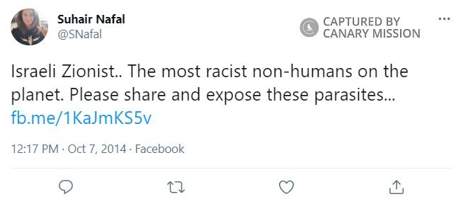 On October 7, 2014, Nafal tweeted: “Israeli Zionist.. The most racist non-humans on the planet. Please share and expose these parasites…”