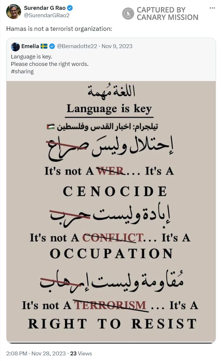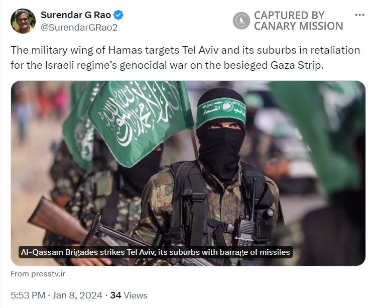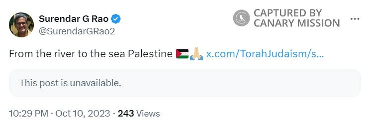 Surendar Rao is a family doctor who defended Hamas terrorists, called for Israel’s destruction and spread anti-Semitic conspiracy theories on social media in late 2023 and early 2024.Rao published his remarks in the wake of Hamas terror atrocities and war crimes against Israeli civilians, including mass murder, torture, rape, beheadings and kidnappings, which were executed on October 7, 2023.
