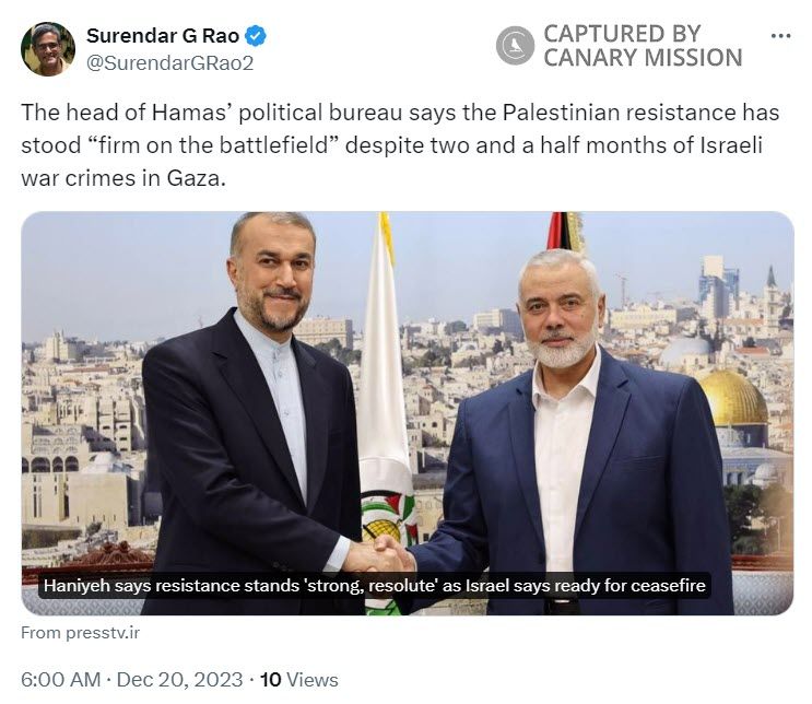 On November 28, 2023, Rao tweeted: “Hamas is not a terrorist organization:”On December 20, 2023, Rao tweeted: “The head of Hamas’ political bureau says the Palestinian resistance has stood ‘firm on the battlefield’ despite two and a half months of Israeli war crimes in Gaza.”