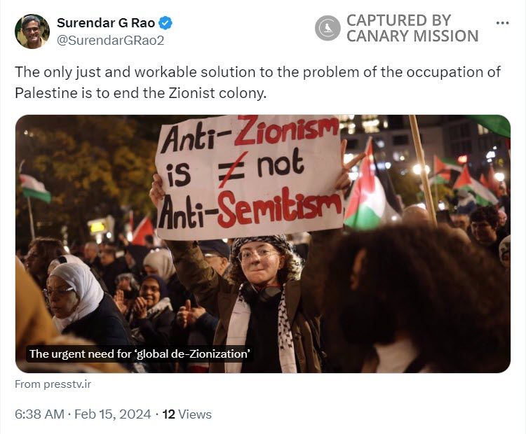 On February 15, 2024, Rao tweeted about Israel: “The only just and workable solution to the problem of the occupation of Palestine is to end the Zionist colony.”Zionism is the belief that Jews have the right to self-determination in their own national home, and the right to develop their national culture.
