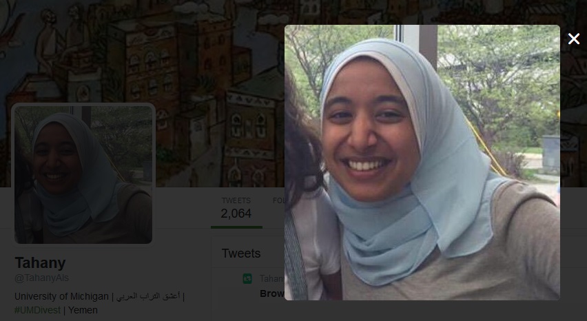 Tahany Alsabahi is a member ofStudents Allied for Freedom and Equality (SAFE), a chapter of Students for Justice in Palestine (SJP) at the University of Michigan-Ann Arbor (UM Ann Arbor).