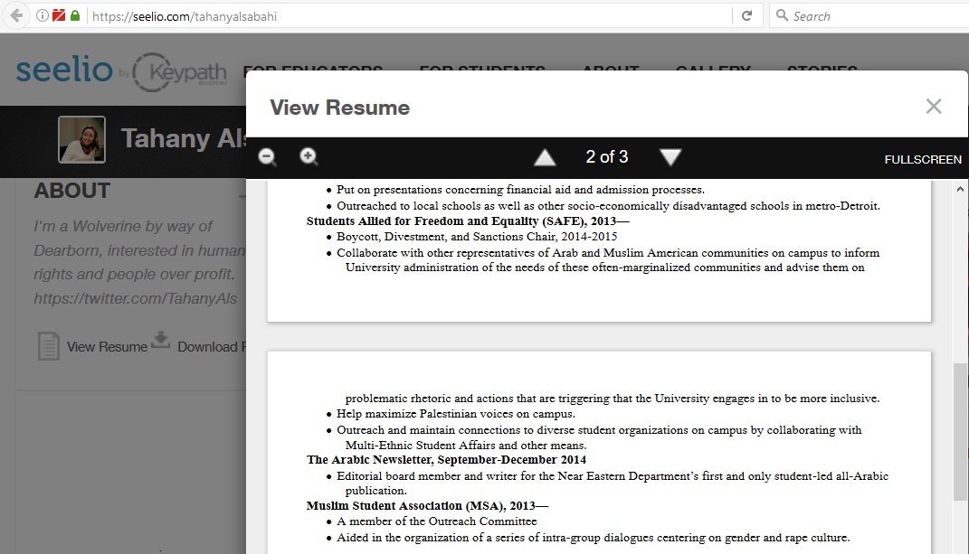 Alsabahi served as SAFE’s Boycott, Divestment and Sanctions (BDS) chair from 2014 until 2015, and promotes BDS on her Seelio page.