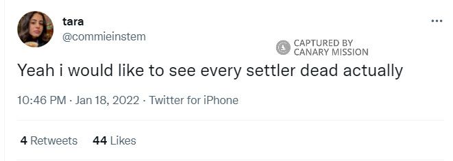 On January 18, 2022, Alami tweeted: “Yeah i would like to see every settler dead actually.” A day later, Alami indicated on Twitter that she considers every Israeli Jew a “settler.”