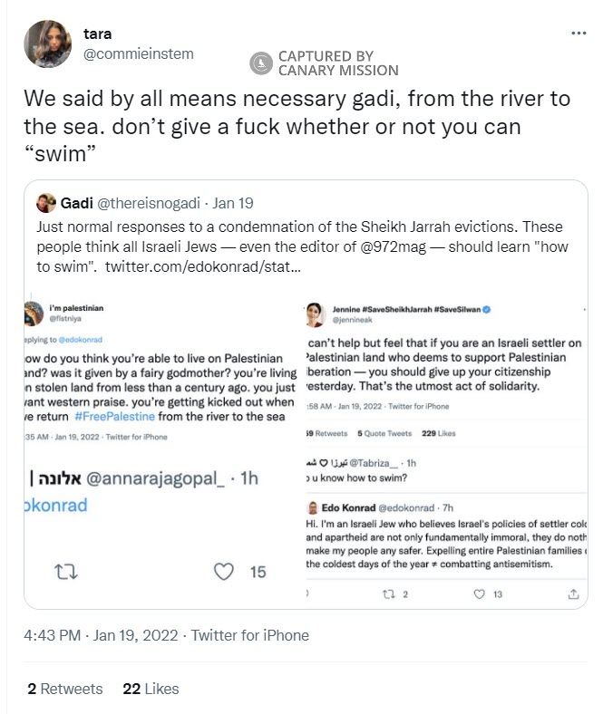 On January 22, 2022, Alami tweeted to an Israeli Jew: “We said by all means necessary gadi, from the river to the sea. don’t give a f**k whether or not you can ‘swim’.”