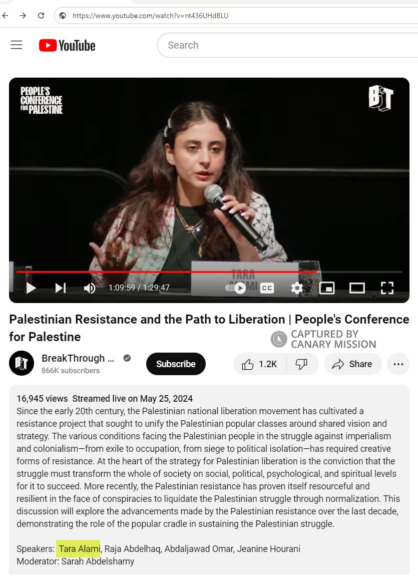 On May 25, 2024, Alami spoke [01:09:46] at a plenary session at the People’s Conference for Palestine titled: “Palestinian Resistance and the Path to Liberation.”The conference was organized by anti-Israel groups, including PYM, SJP and Al-Awda, and was held in Detroit, Michigan, on May 24-26, 2024.