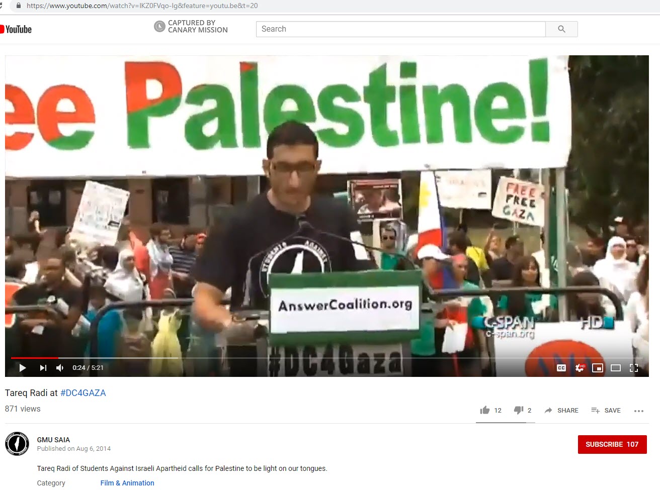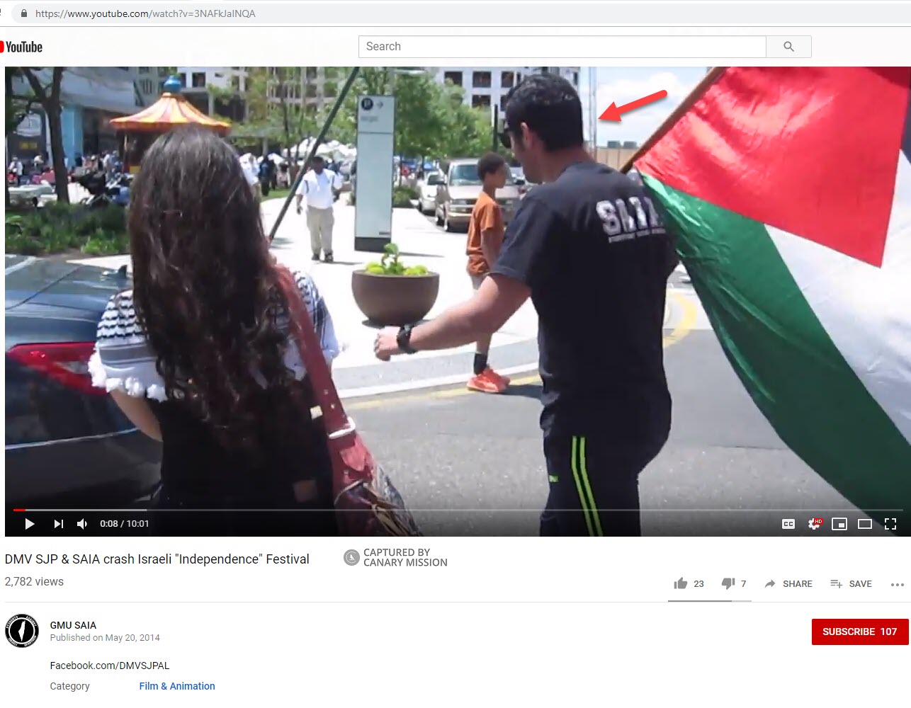 On May 18, 2014, Radi, carrying [00:00:08] a Palestinian flag and wearing a shirt with the SAIA emblem, led a disruption of an Israeli Independence Festival in Fairfax, Virginia with other SJP and SAIA members from Washington D.C., Maryland and Virginia (DMV-SJP).
