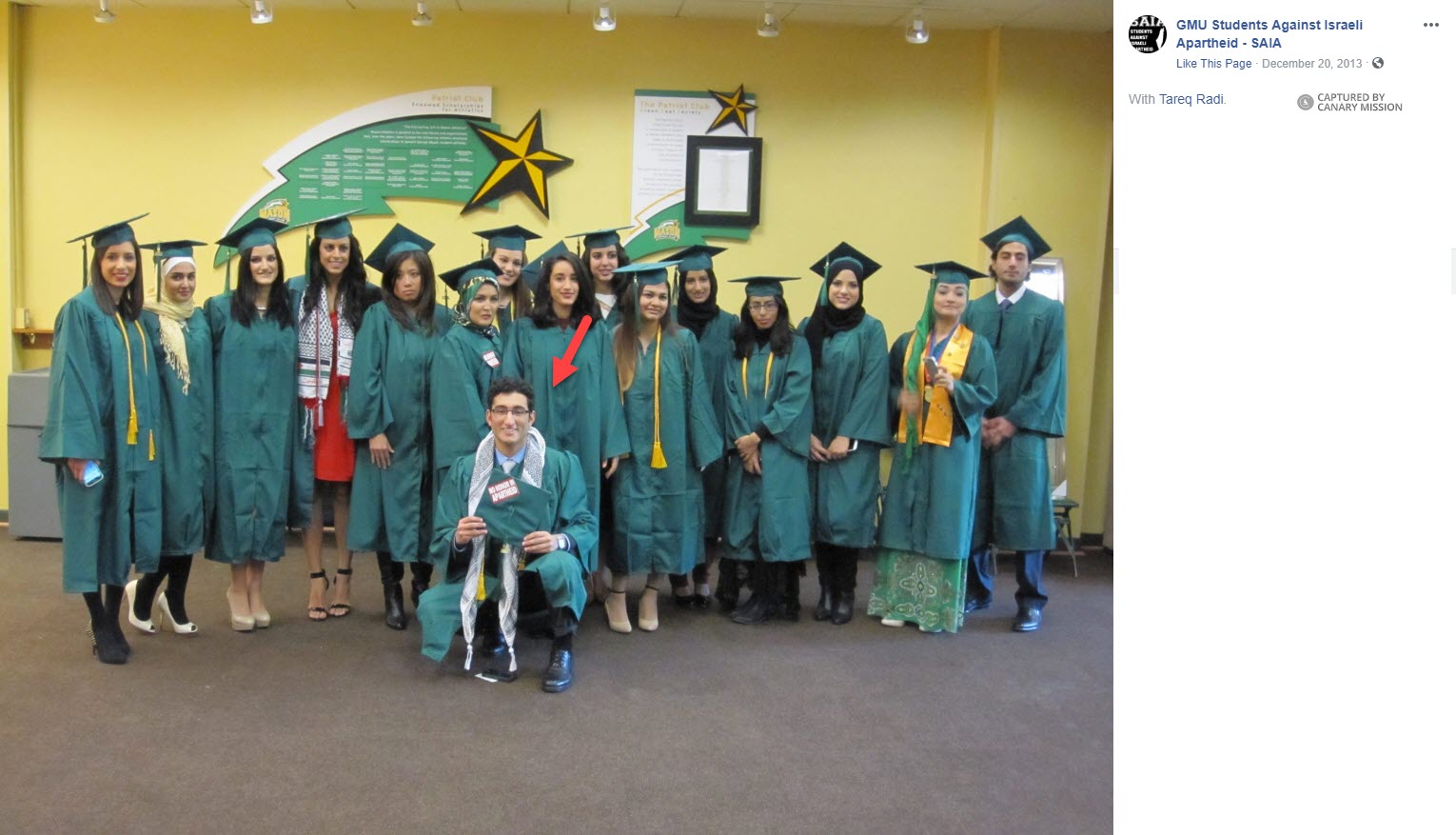 On December 19, 2013, Radi participated [00:05:17] in an SAIA walkout of GMU’s Winter Commencement ceremony, during a speech given by American-Israeli businesswoman and philanthropist, Shari Aronson.During the walk-out, several graduates reportedly wore “no honor in apartheid” stickers on the tops of their graduate caps while their guests waved [00:02:04]keffiyehs.