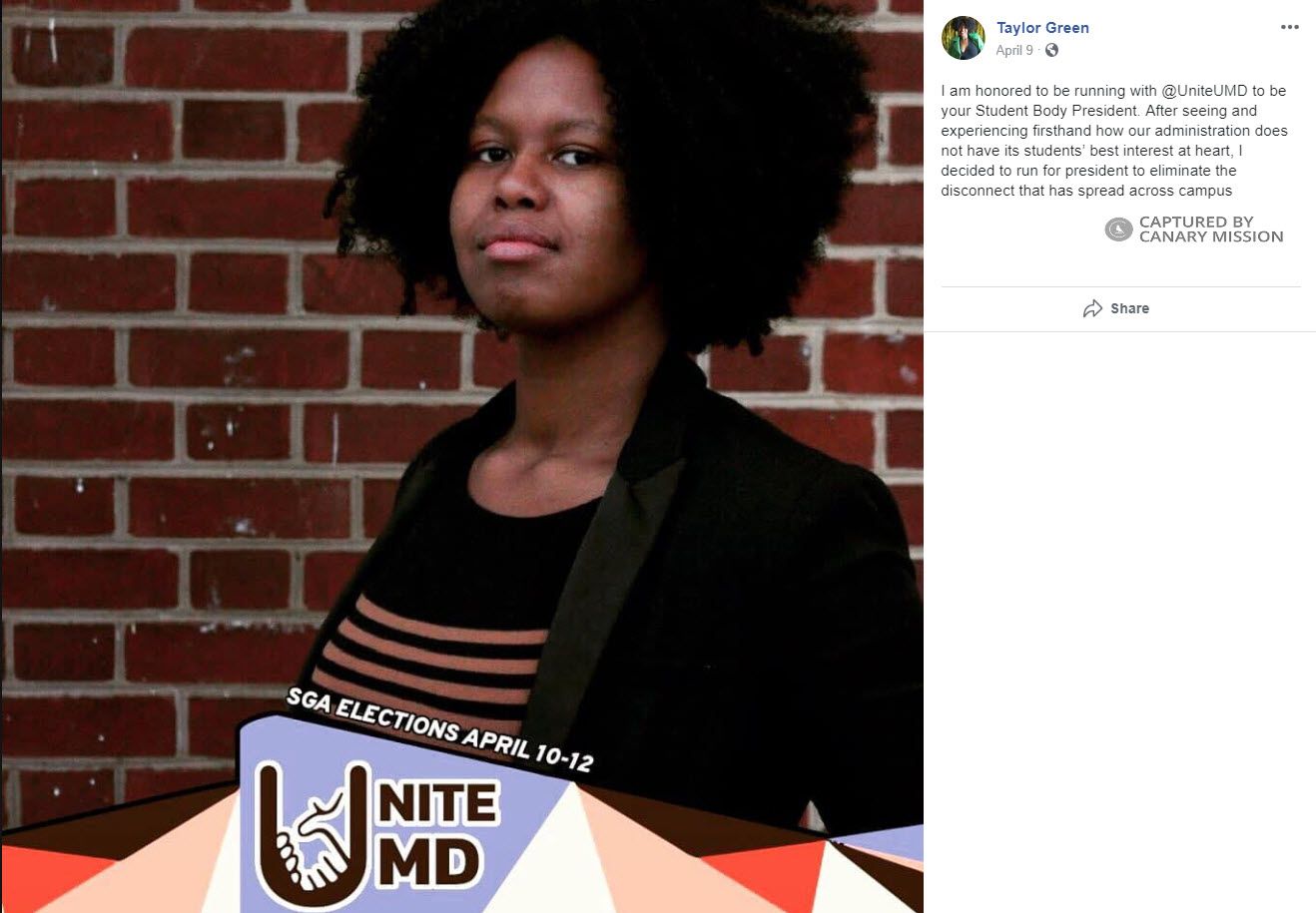 In an April 2019 Facebook video, Green said she was a “Junior” at UMD.