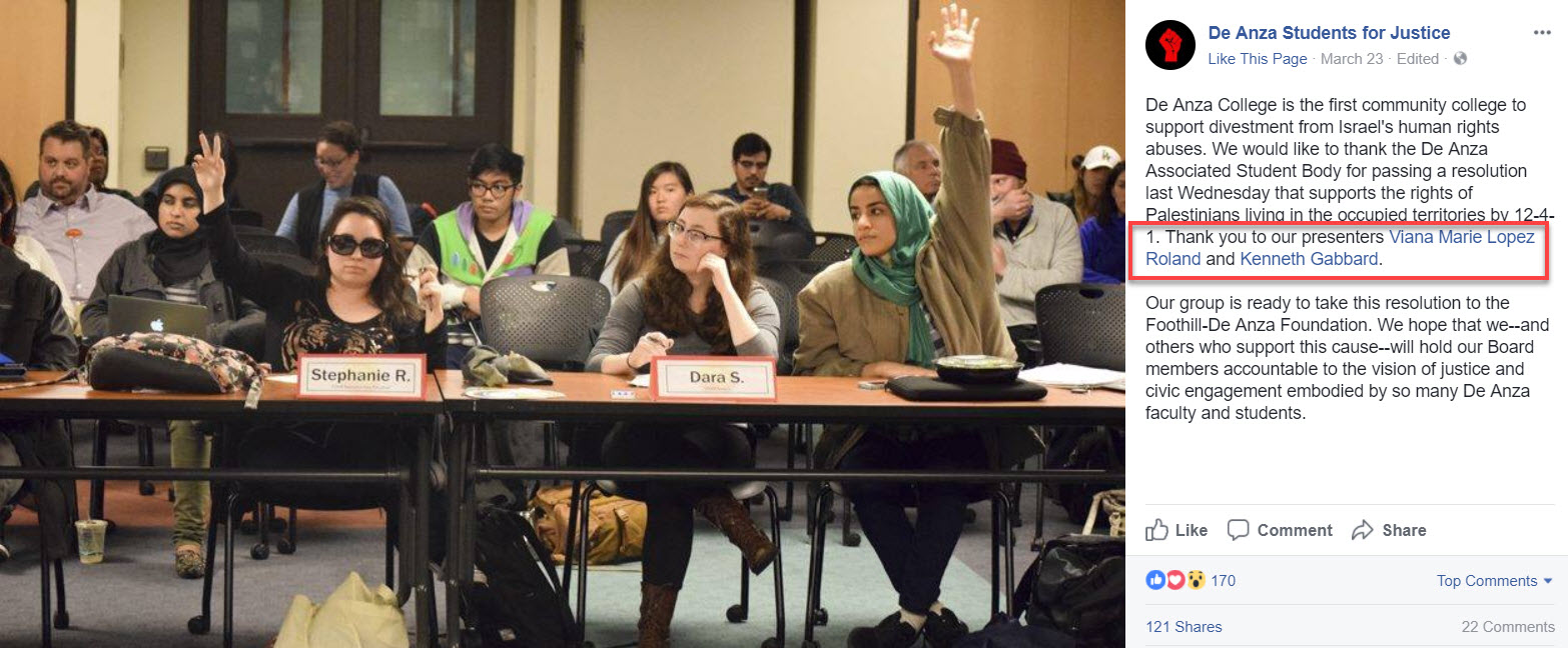 Viana Marie Lopez [Viana Marie Lopez Roland] has spread hatred of Israel, promoted conspiracy theories and presented a Boycott, Divestment, Sanctions (BDS) resolution that marginalized Jewish students at De Anza College (De Anza).Lopez is an advocate for the BDS movement and was the co-chair of De Anza Students For Justice (SFJ). SFJ was praised by Students for Justice in Palestine (SJP) West, a coalition of West Coast SJP chapters, for being the first community college student group to successfully pass a BDS resolution.