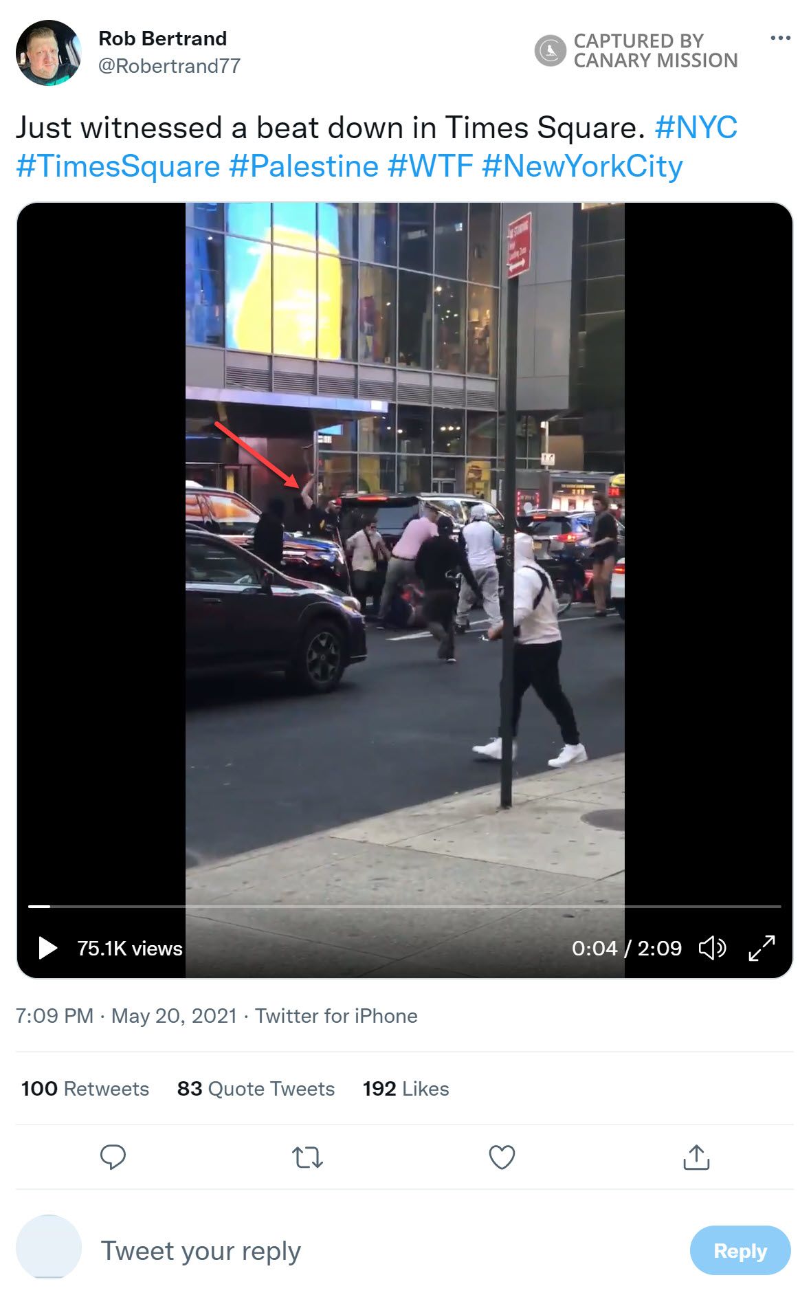 That same day, Awawdeh was standing [00:00:11] on a moving vehicle, waving his crutch in a celebratory manner while Mohammed Othman, another anti-Israel activist who attended the counter-protest, threw [00:00:01] a firework [00:00:03] at passersby in Manhattan's, heavily-Jewish Diamond District, burning a woman.As police and passersby then tended [00:00:34] to an injured person lying on the ground, anti-Israel activists drove [00:00:19] and walked by shouting abuse from their car windows, while others on the street pushed [00:00:37] people and yelled [00:00:48]: “F**k the Zionists, f**k you!”