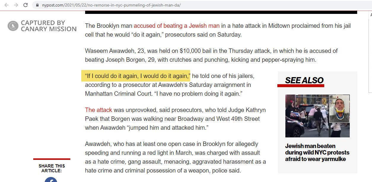 Also on May 20, 2021, Awawdeh was involved in another violent mob attack and spat on a police officer in Times Square. He was participating in a counterprotest against the pro-Israel rally that Borgen planned on attending.