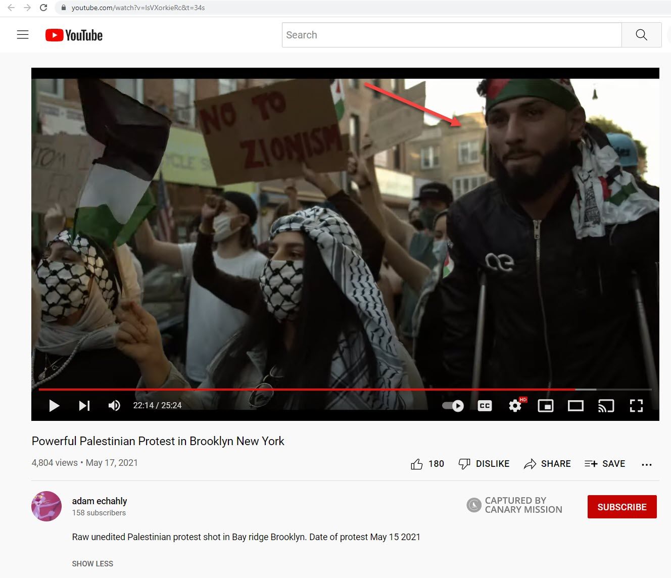 In a May 17, 2021, YouTube video of the May 15 protest, Awawdeh can be seen [00:22:02] walking towards the camera on the right-hand side of the screen, wearing a green, white and red headband, a black jacket and holding a crutch.