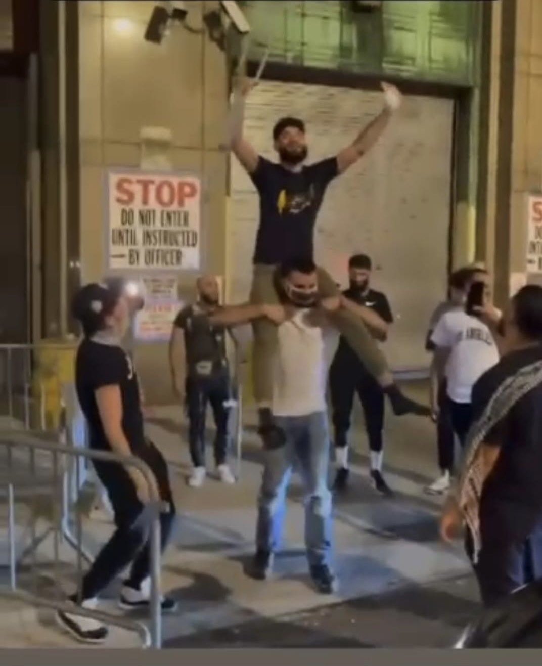 Awawdeh was part [00:00:52] of a mob that attacked at an Israel supporter during a pro-Israel rally in Times Square.Awawdeh was standing [00:00:11] aboard a moving vehicle from which a firework was thrown [00:00:01] at passersby, burning a woman in Manhattan's heavily- Jewish, Diamond District.