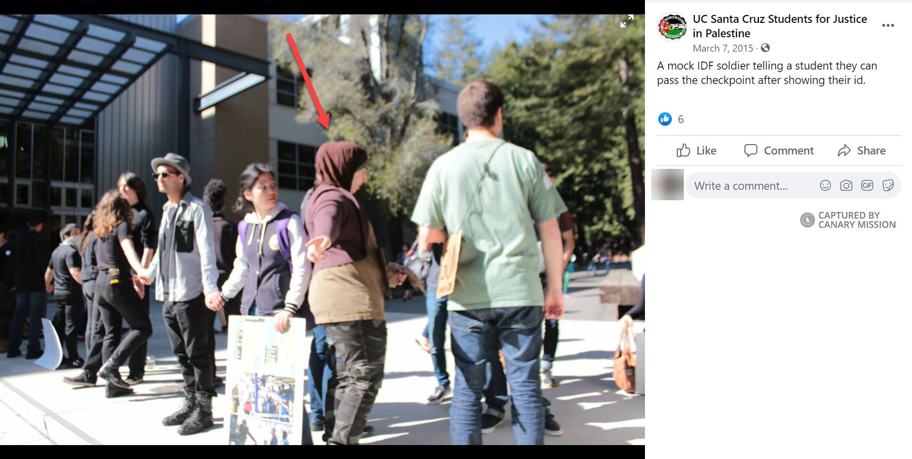 Also on March 4, 2015, UCSC SJP posted to Instagram a photo with its activists taking part in a mock Israeli checkpoint. One hashtag accused Israel of “#apartheid” and another was “#bringdownthewall,” referring to Israel’s security barrier.