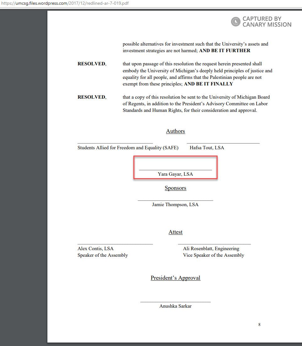 Gayar co-authored the resolution as a student representative in the University of Michigan, Ann Arbor (UM Ann Arbor) Central Student Government (CSG) along with the campus SJP chapter, Students Allied with Freedom and Equality (SAFE).