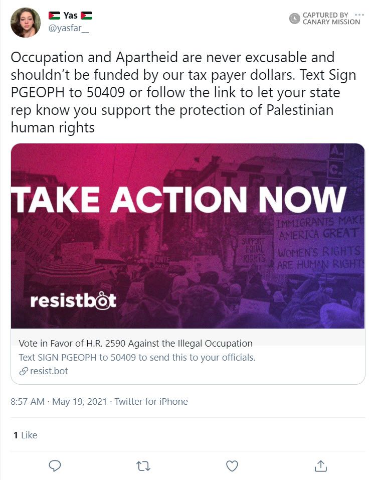 On May 19, 2021, Farsakh tweeted a link to the same open letter in support of Bill H.R. 2590 and commented: “Occupation and Apartheid are never excusable and shouldn’t be funded by our tax payer dollars. Text Sign PGEOPH to 50409 or follow the link to let your state rep know you support the protection of Palestinian human rights.”
