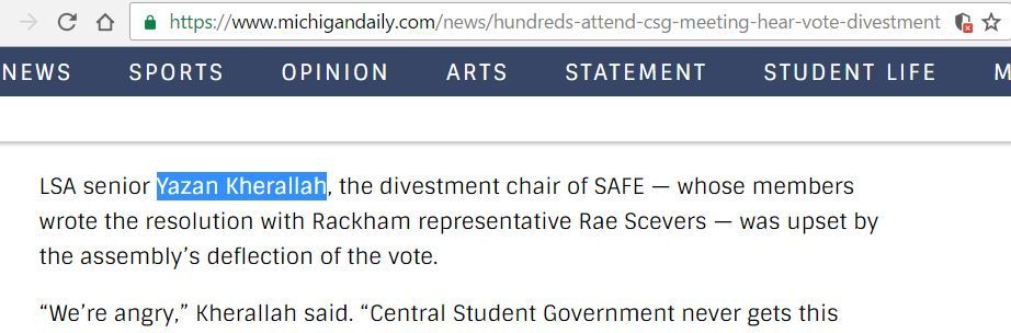Yazan Kherallah [Yazan "Zune" Kherallah] was the Divestment Chair of Students Allied for Freedom and Equality (SAFE) at University of Michigan-Ann Arbor (UM Ann Arbor) in 2014. SAFE is a chapter of Students for Justice in Palestine (SJP).