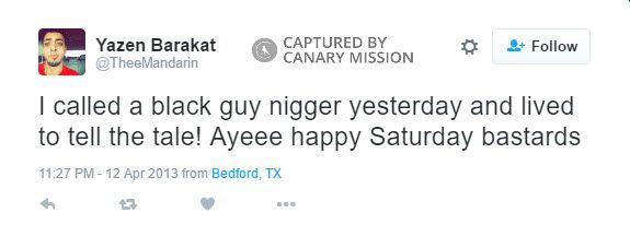 On April 12, 2013, Barakat tweeted: “I called a black guy n**ger yesterday and lived to tell the tale! Ayeee happy Saturday bastards.”