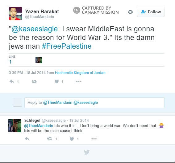 On July 18, 2014, Barakat tweeted: “‘@kaseeslagle: I swear MiddleEast is gonna be the reason for World War 3.’ Its the damn jews man #FreePalestine.”