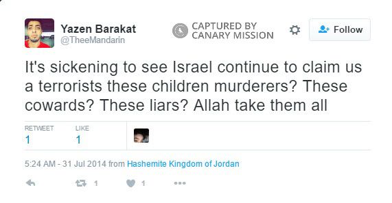 On August 2, 2014, Barakat tweeted: “Glad too see people finally realize Israel are the real terrorists.”