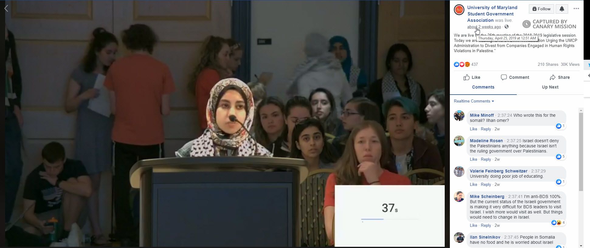 In the video, Nassar said [02:37:51]: “I am here in support of the divestment bill, because it’s a peaceful form of protest and statement that says that we, as the students and the community of UMD do not support human rights violations.”