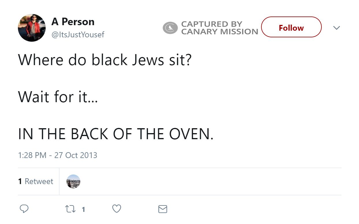 On October 27, 2013, Mohamed tweeted: “Where do black Jews sit? Wait for it...IN THE BACK OF THE OVEN.”Anti-Semitism