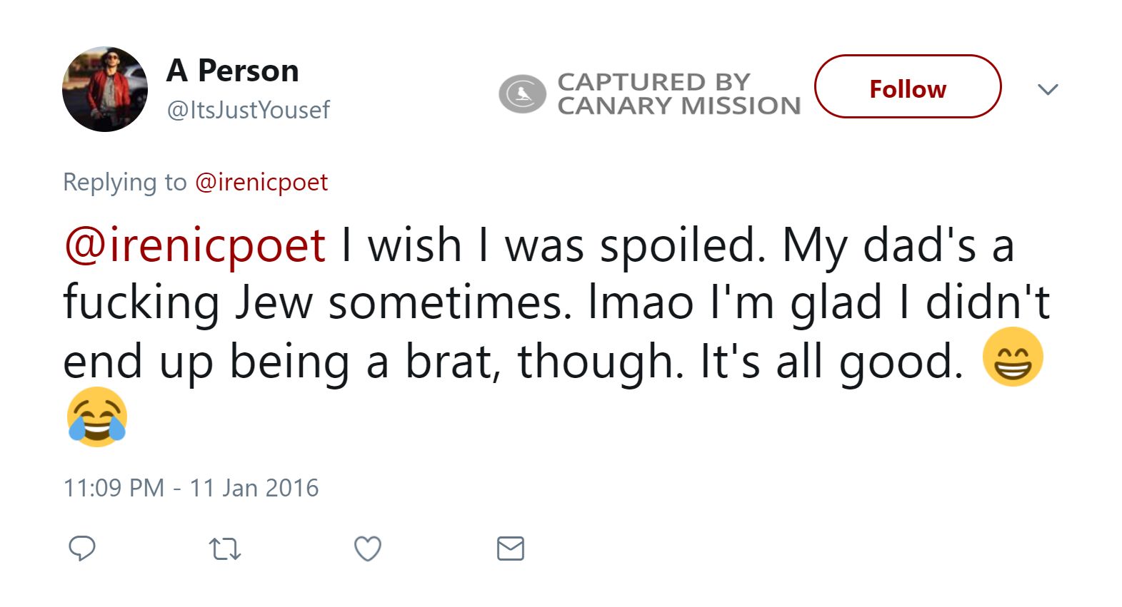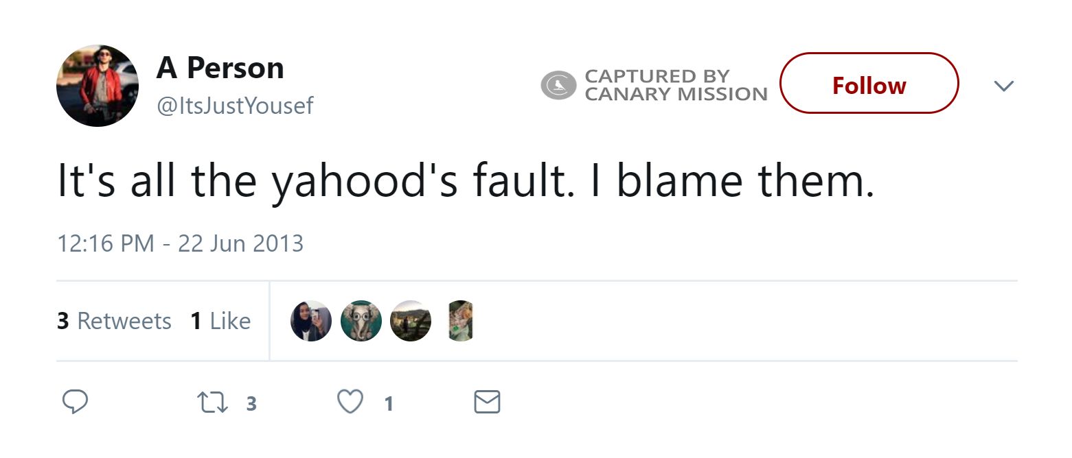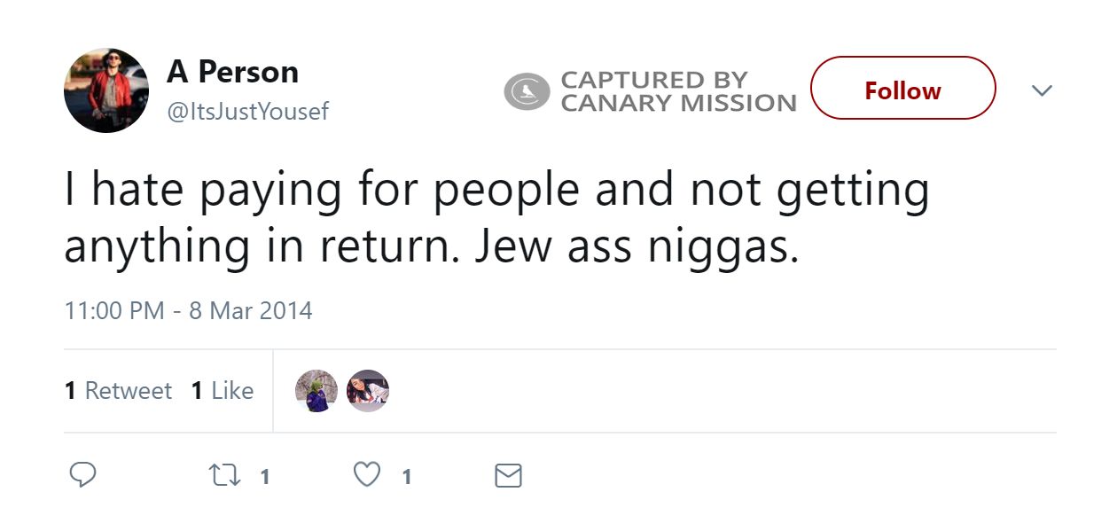 On January 11, 2016, Mohamed tweeted: “@irenicpoet I wish I was spoiled. My dad's a f**king Jew sometimes. lmao I'm glad I didn't end up being a brat, though. It's all good.On January 13, 2014, Mohamed tweeted: “@Pali_Nawal19 @WajeehHasan2 I don't give discounts to yahoodi [Jewish] bi**hes, though, so go f**k yourselves.”