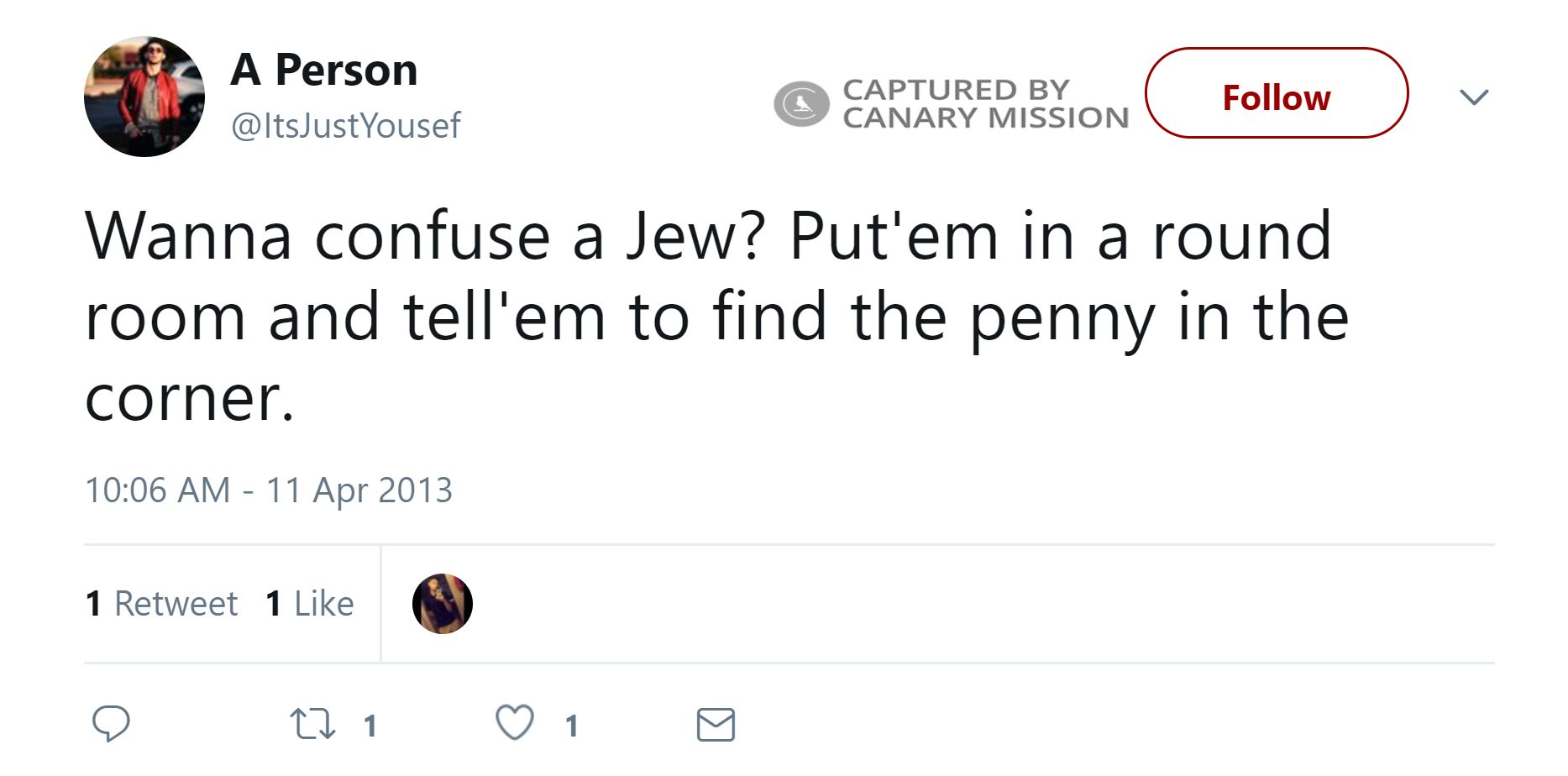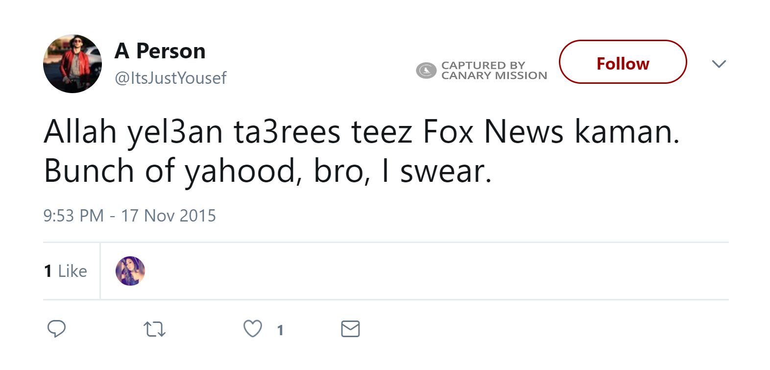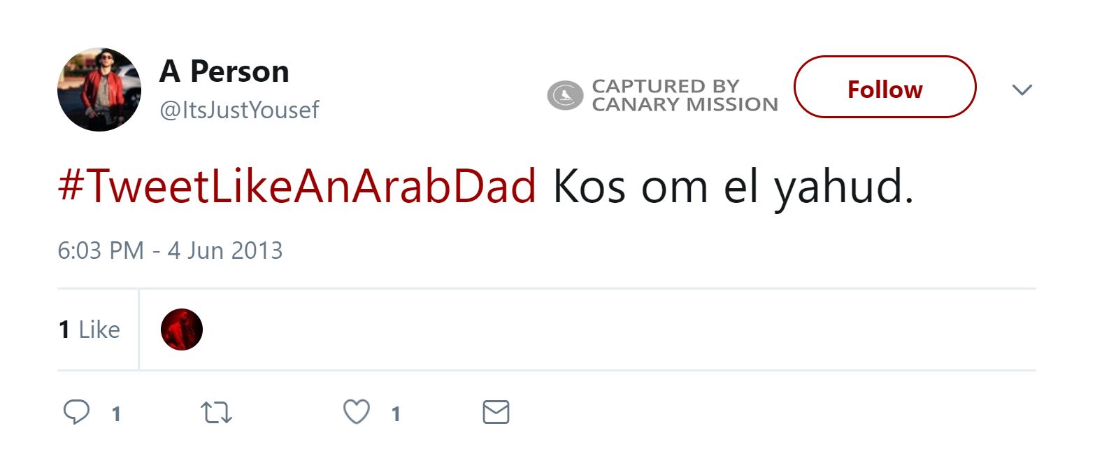 On June 4, 2013, Mohamed tweeted: “#TweetLikeAnArabDad Kos om el yahud [F**k Jewish mothers].”