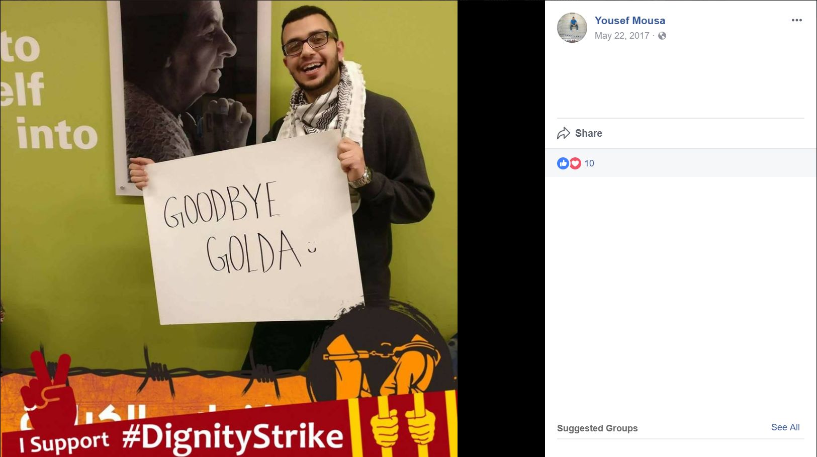 On May 22, 2017, Mousa also shared a photo of himself on Facebook holding a sign that said: “Goodbye Golda” in front of a picture of Meir.