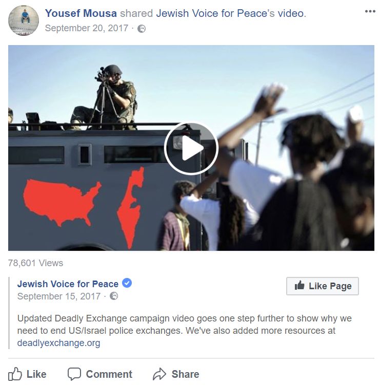 On September 20, 2017, Mousa shared a video on Facebook from the anti-Israel Jewish Voice for Peace (JVP) organization promoting the “Deadly Exchange” campaign. The video blamed [00:04:04] U.S.-based Jewish organizations for violence that occurs against Black and Brown communities, immigrants and activists in the U.S.