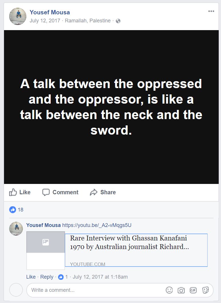 On July 12, 2017, Mousa posted a Facebook graphic that paraphrased a quote [00:00:23] by Palestinian terrorist Ghassan Kanafani rejecting negotiations as a path to peace. Mousa then linked to the interview in which Kanafani said the quote.Kanafani was a leading member and spokesperson for the Popular Front for the Liberation of Palestine (PFLP) during the terrorist organization’s early years. Kanafani announced the PFLP’s responsibility for the Lod Airport Massacre of May 1972 and was linked to the airport attackers. The attack killed 26 people and wounded 80 others.