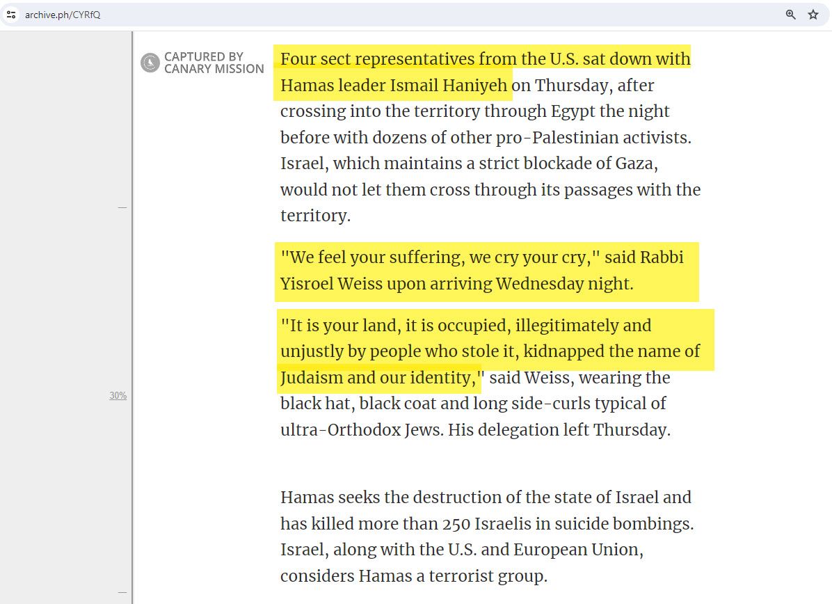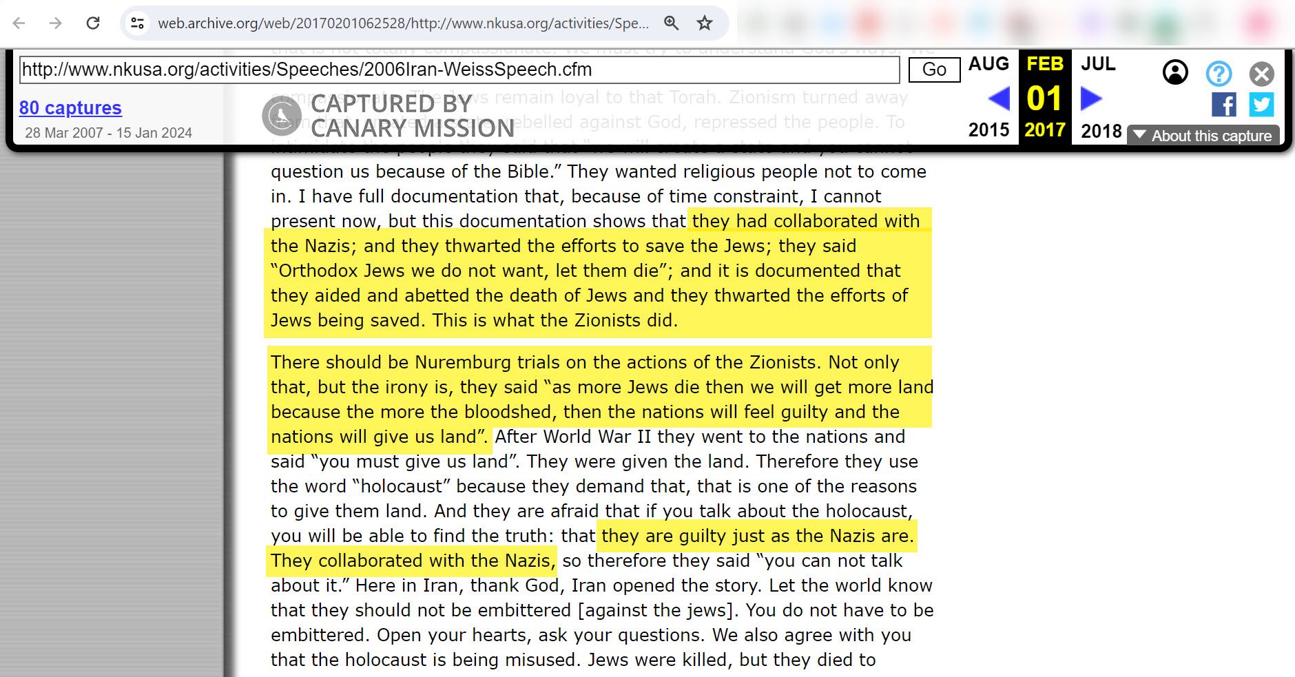 NKI members, dressed in ultra-Orthodox Hasidic garb, are regular fixtures at anti-Israel protests, especially in New York City. Anti-Semites use NKI’s presence at such protests to deflect the criticism that calling for Israel’s destruction is anti-Semitic.