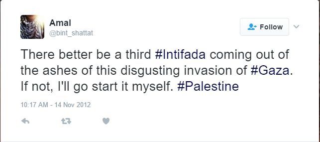 “There better be a third #Intifada coming…If not, I’ll go start it myself. #Palestine.”