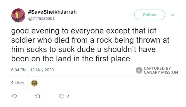 “good evening to everyone except that idf [Israel Defense Forces] soldier who died from a rock being thrown at him sucks to suck dude u shouldn’t have been on the land in the first place.”