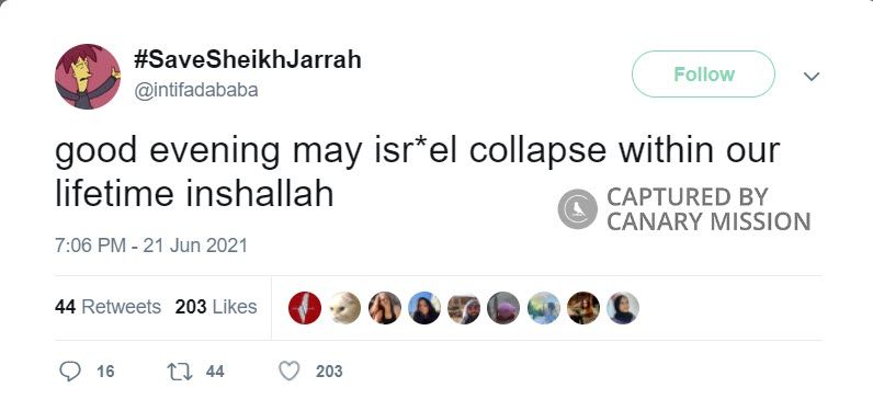 “good evening may isr*el collapse within our lifetime inshallah [god willing].”