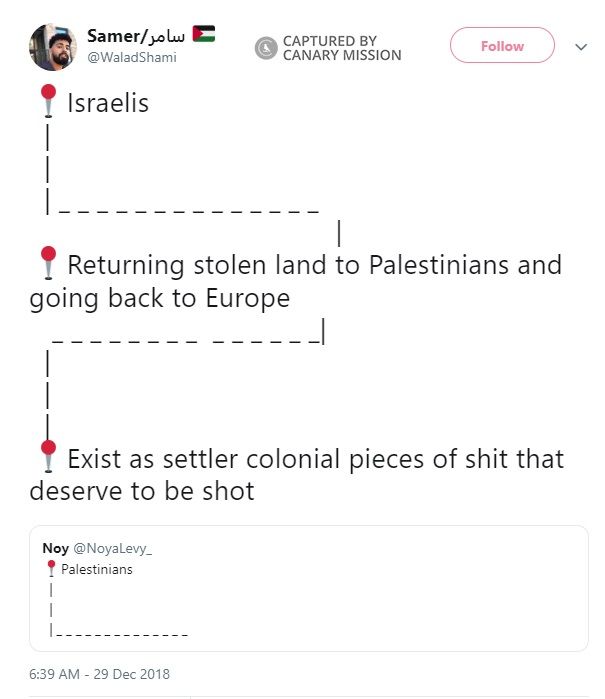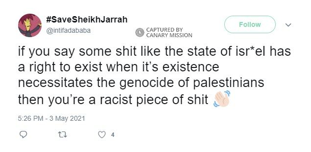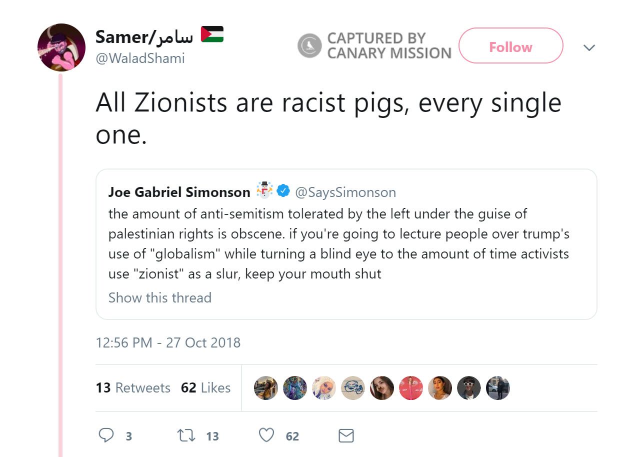 “F**k Israel and every single supporter of Zionism. يا كلاب [O dogs] يا زبالة [O garbage].”