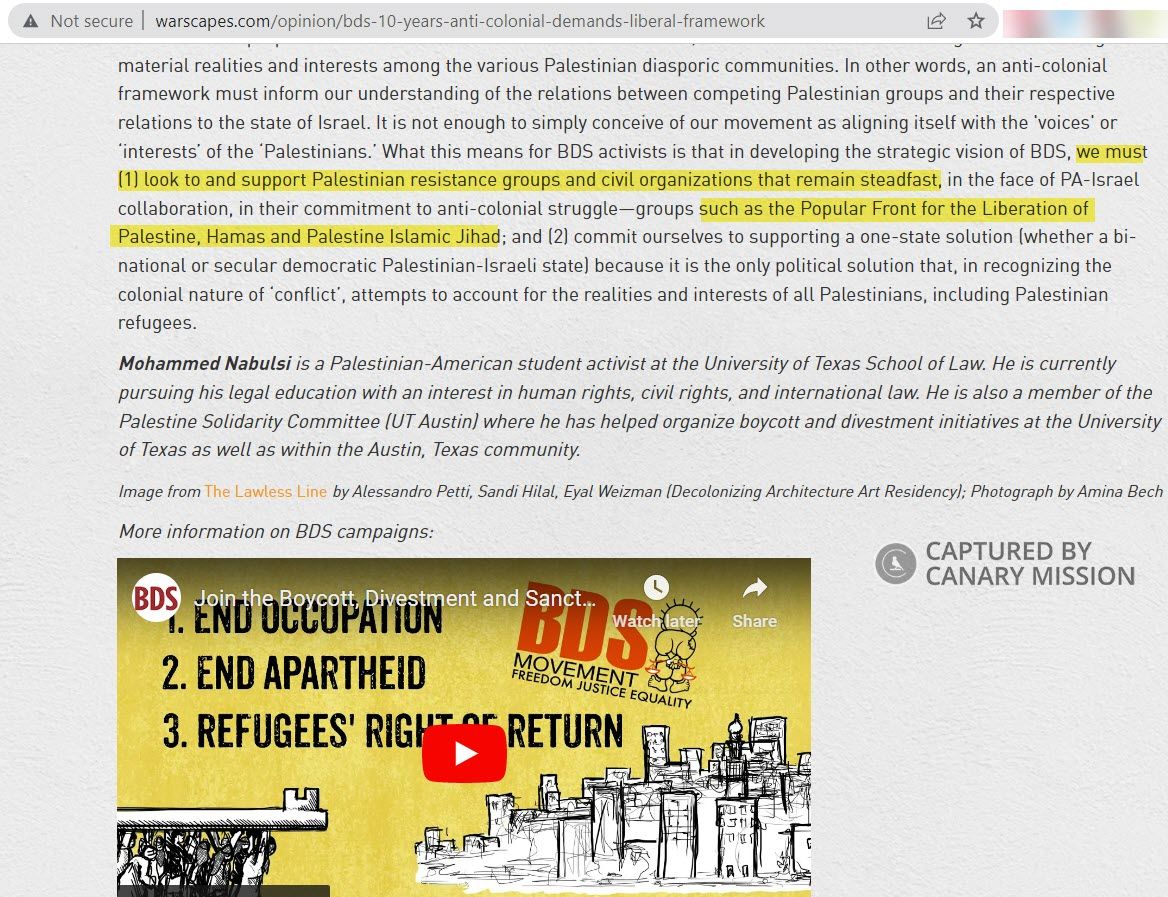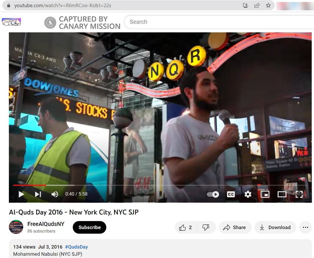 Mohammed Nabulsi has been an activist with PYM since 2017. Nabulsi served [p. 19] as a PYM National Executive Board Member since 2017, the PYM Vice General Coordinator in 2021 and a member of PYM’s Houston chapter in 2022. Nabulsi has called for intifada violence, glorified Hamas and other terror groups, disrupted campus events and spread hatred of Israel.