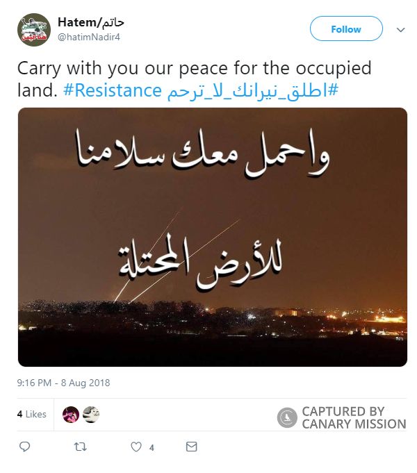 “Carry with you our peace for the occupied land. #Resistance #اطلق_نيرانك_لا_ترحم [Open fire and don’t have mercy].”
