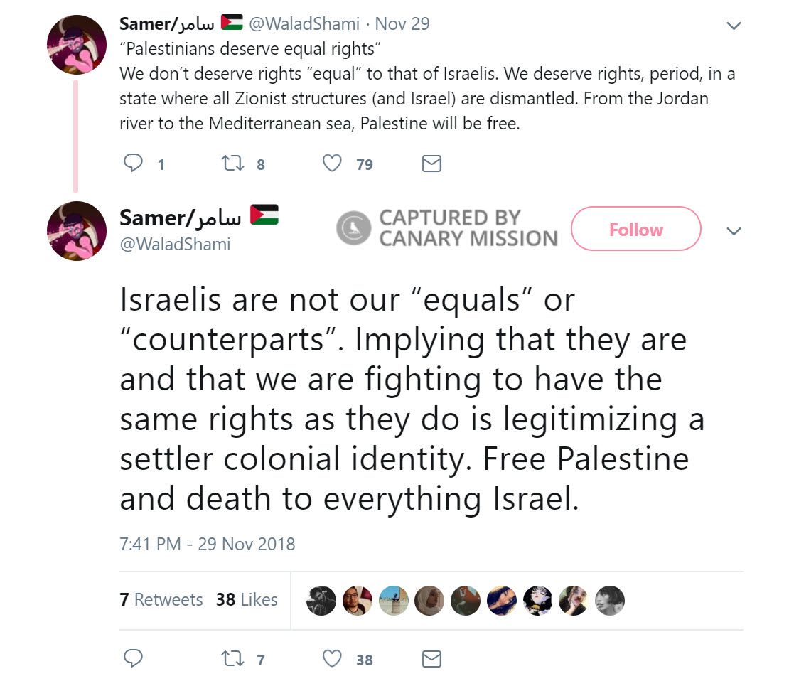“Israelis are not our ‘equals’ or ‘counterparts’…Free Palestine and death to everything Israel.”