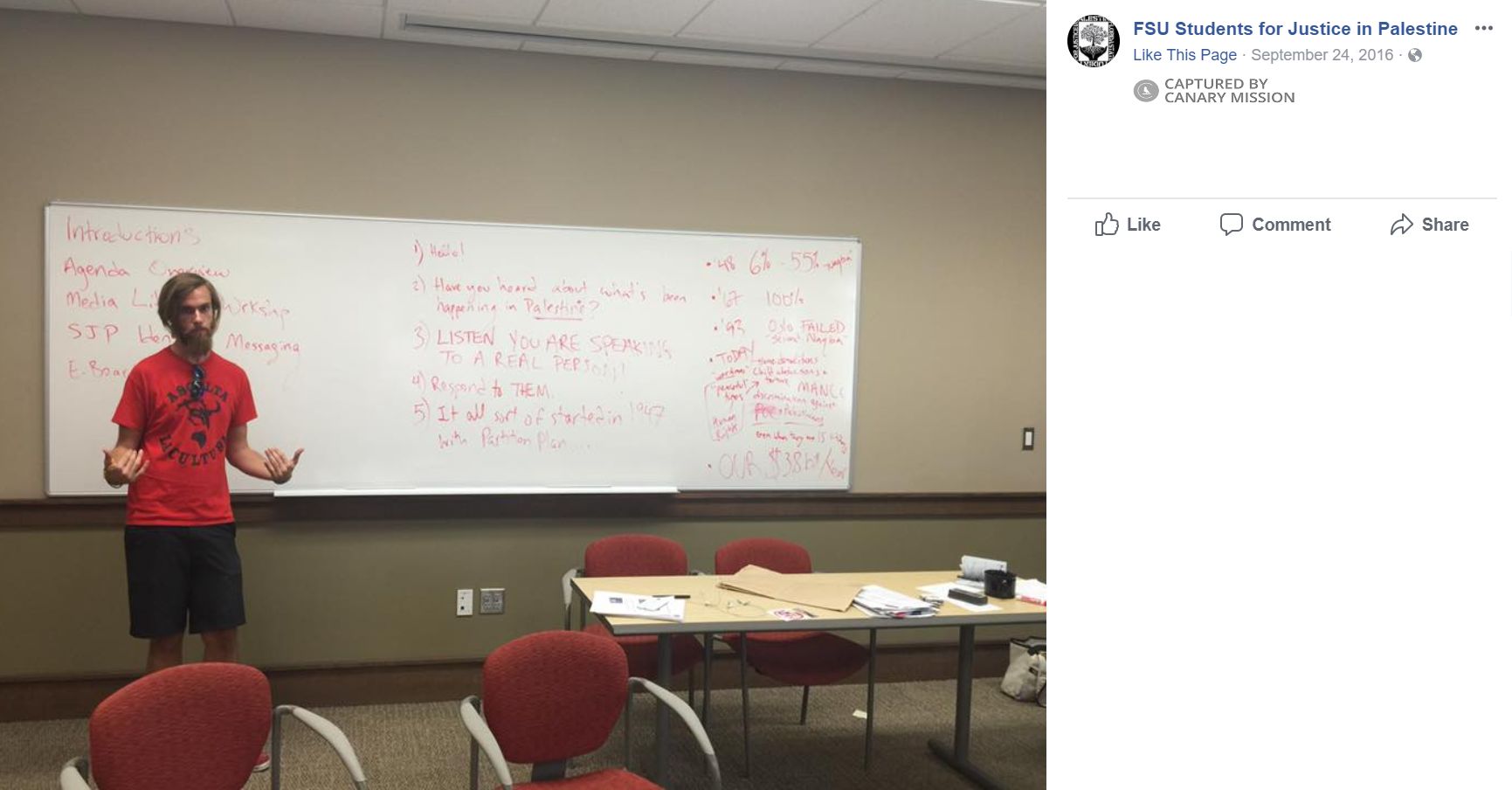 On April 4, 2019, FSU SJP promoted an event on Facebook where they would “be delving further into the topics that you all saw on our wall and we will be going deeper into the issues surrounding Palestine, Gaza, the Great Return March, Zionism, & Israel.”