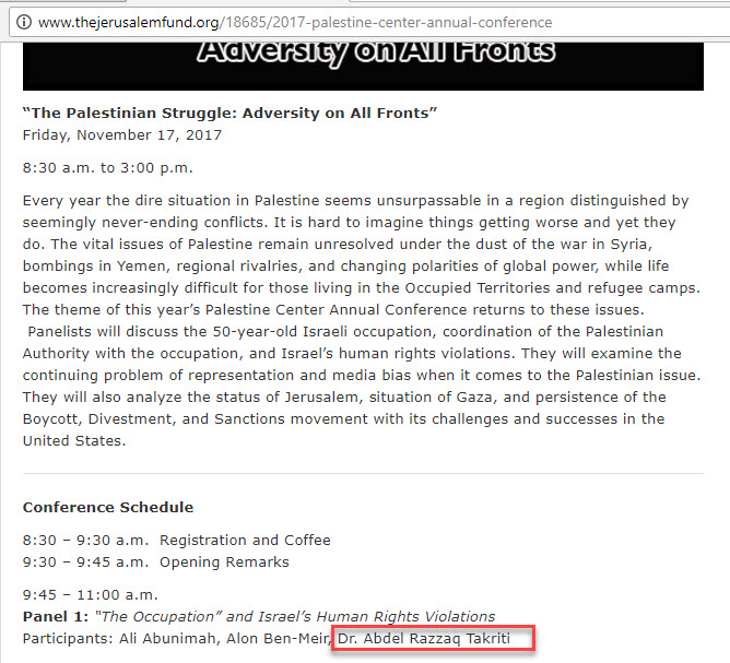 On November 17, 2017 Takriti was scheduled to appear on a panel discussion titled “‘The Occupation’ and Israel’s Human Rights Violations.” The event is part of The Jerusalem Fund’s “The Palestinian Struggle: Adversity on All Fronts” conference.On October 27, 2017, Takriti participated in a plenary discussion at the National SJP Conference.