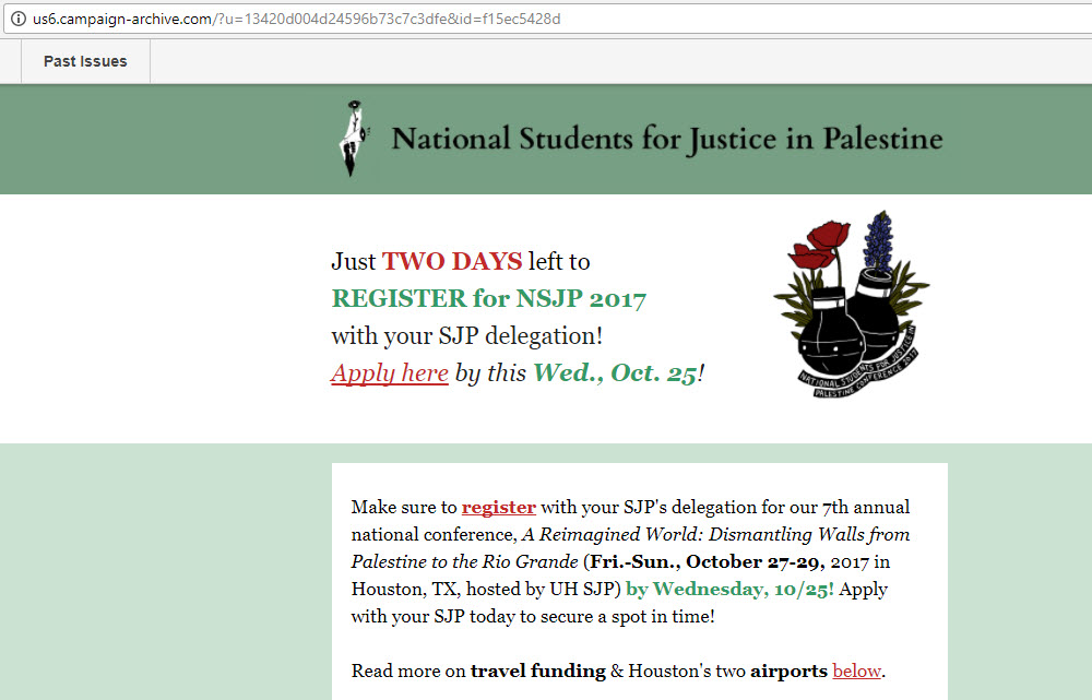 NJSP 2017 was scheduled for October 27-29, 2017, in Houston, TX. The conference was themed “A Reimagined World: Dismantling Walls from Palestine to the Rio Grande.” Per the National Students for SJP 2017 Conference website, the conference aimed to strengthen “collaborative efforts within all regions to pass BDS” and envision “pathways to achieving sanctions in the future.”